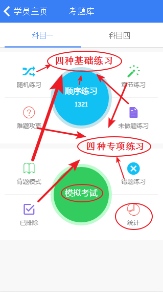 考题库考题练习类型有随机练习、顺序练习、未做题练习、背题模式四种基础练题方式和章节练习、难题攻克、错题练习和已排除四种专项练习;底部是科目一和科目四的模拟考试和练习统计。