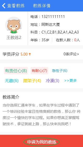查看教练分全部教练和类型选择,主要查看教练的个人资料和联系方式以及学员对教练的评价和评分,另外“我的教练”可以查看我的教练相关信息并且可以申请更换教练。