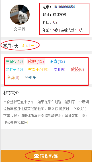 主要是查看教练的评分、学员对教练的评价及印象评价,然后就是教练的基本个人信息和联系方式。