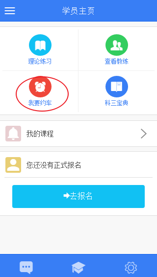 主页面有我要约车、已约课程、训练场地和我的教练四个主要功能。
