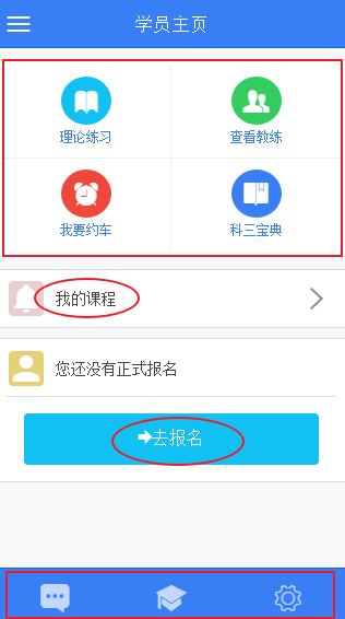学员主页主要有理论联系、查看教练、我要约课、科三宝典4个主要部分。顶部有上车提醒,其次中间是我的课程和报名,然后就是我的教练相关信息,底部是信息、成绩、设置。