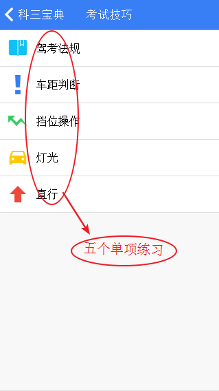 包含单向练习、考试秘笈、灯光操作、语音模拟和考试项目详解。